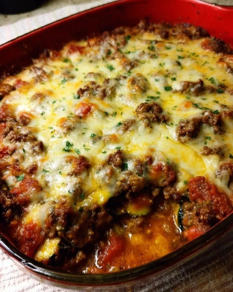 - Layer the Casserole: In a baking dish, layer half of the zucchini slices, followed by the beef mixture and half of the marinara sauce. Then, repeat with another layer of zucchini, the remaining marinara sauce, and finally, top with shredded cheese.