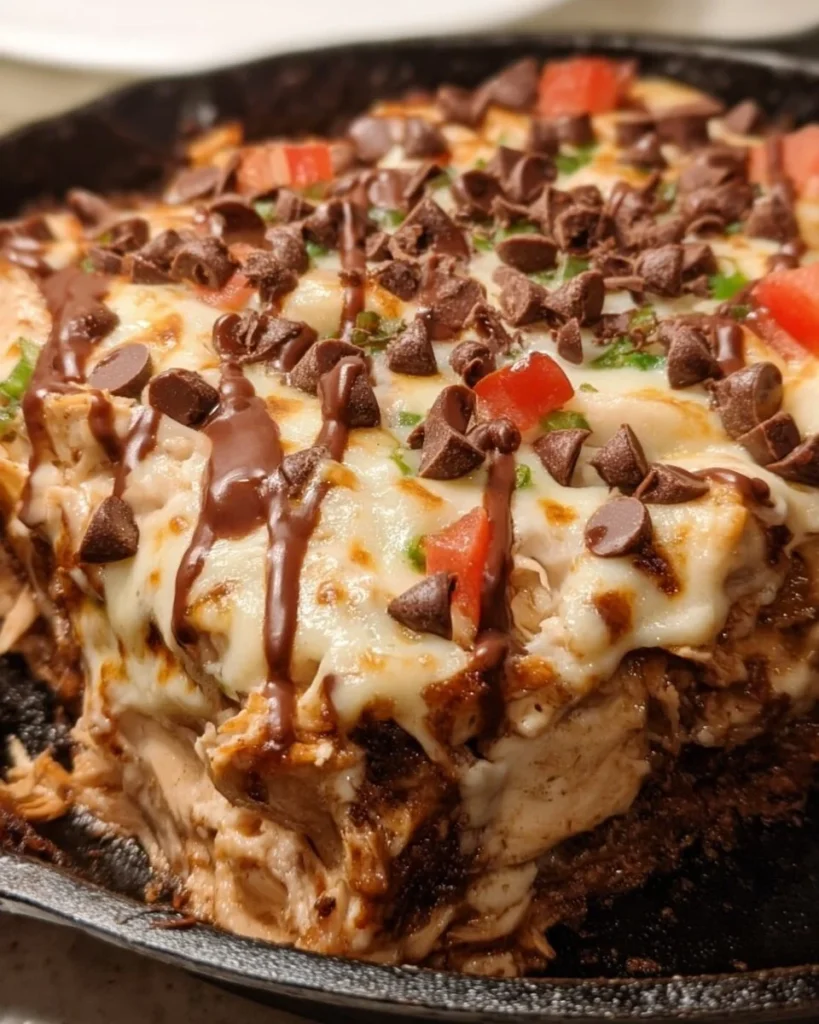 A comforting dish featuring juicy chicken, sautéed peppers, onions, and gooey melted cheese, perfect for family gatherings or cozy dinners.