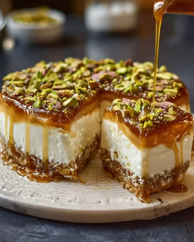 - Cool and Serve: Let the cheesecake cool at room temperature, then refrigerate for at least 2 hours. Drizzle with honey and garnish with extra crushed pistachios before serving. Enjoy!