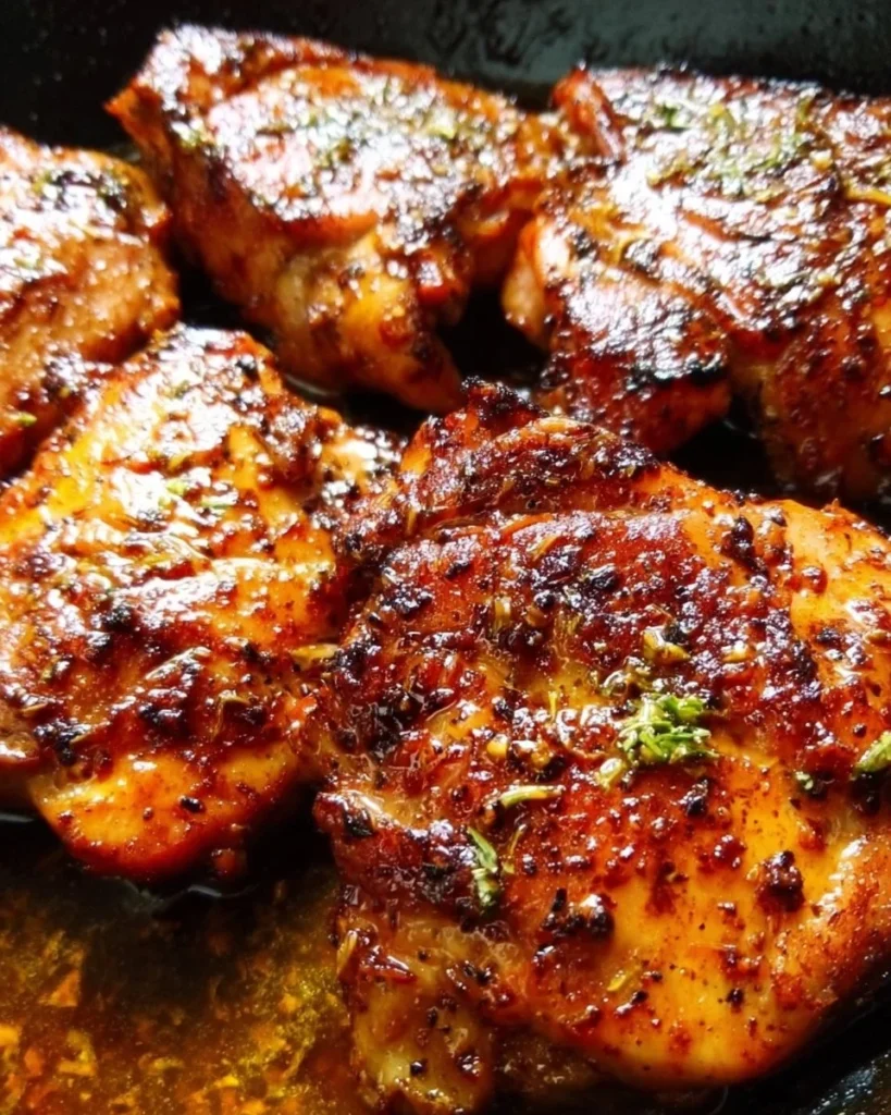 4. Cook the Chicken Thighs: Push the garlic to the sides of the skillet and place the seasoned chicken thighs in the center. Cook for about 4-5 minutes on each side or until golden brown and cooked through.