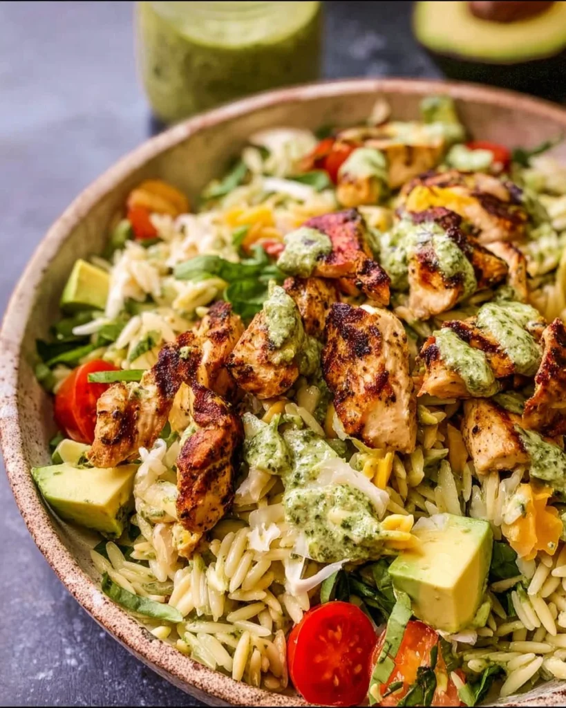 What is Pesto Chicken Avocado Orzo Salad?