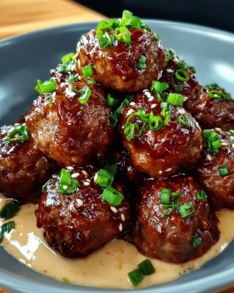 2. Once the meatballs are done, remove them from the oven and gently toss them in the glaze. Garnish with sesame seeds and chopped green onions.