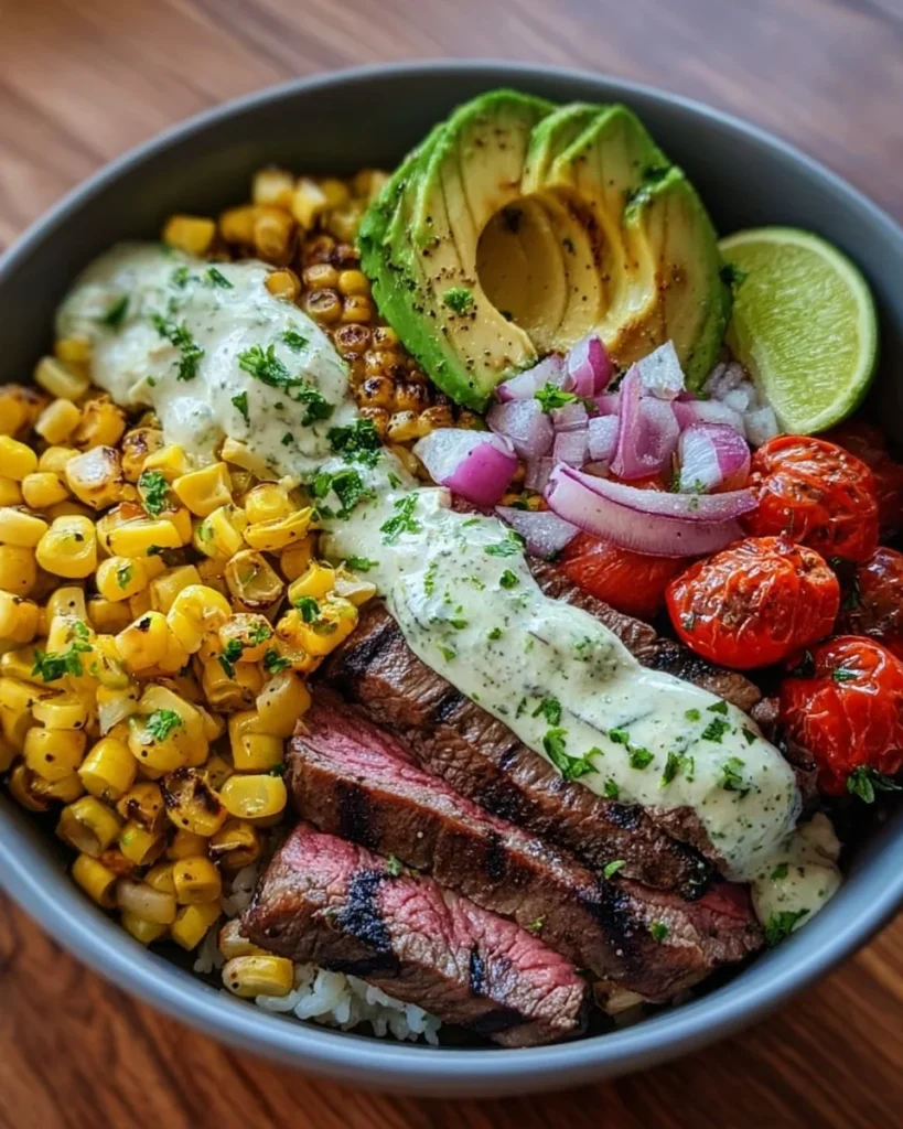 - Assemble the Bowl: In a large bowl, layer the warm roasted corn, diced avocado, and sliced steak. Drizzle generously with cilantro cream sauce.