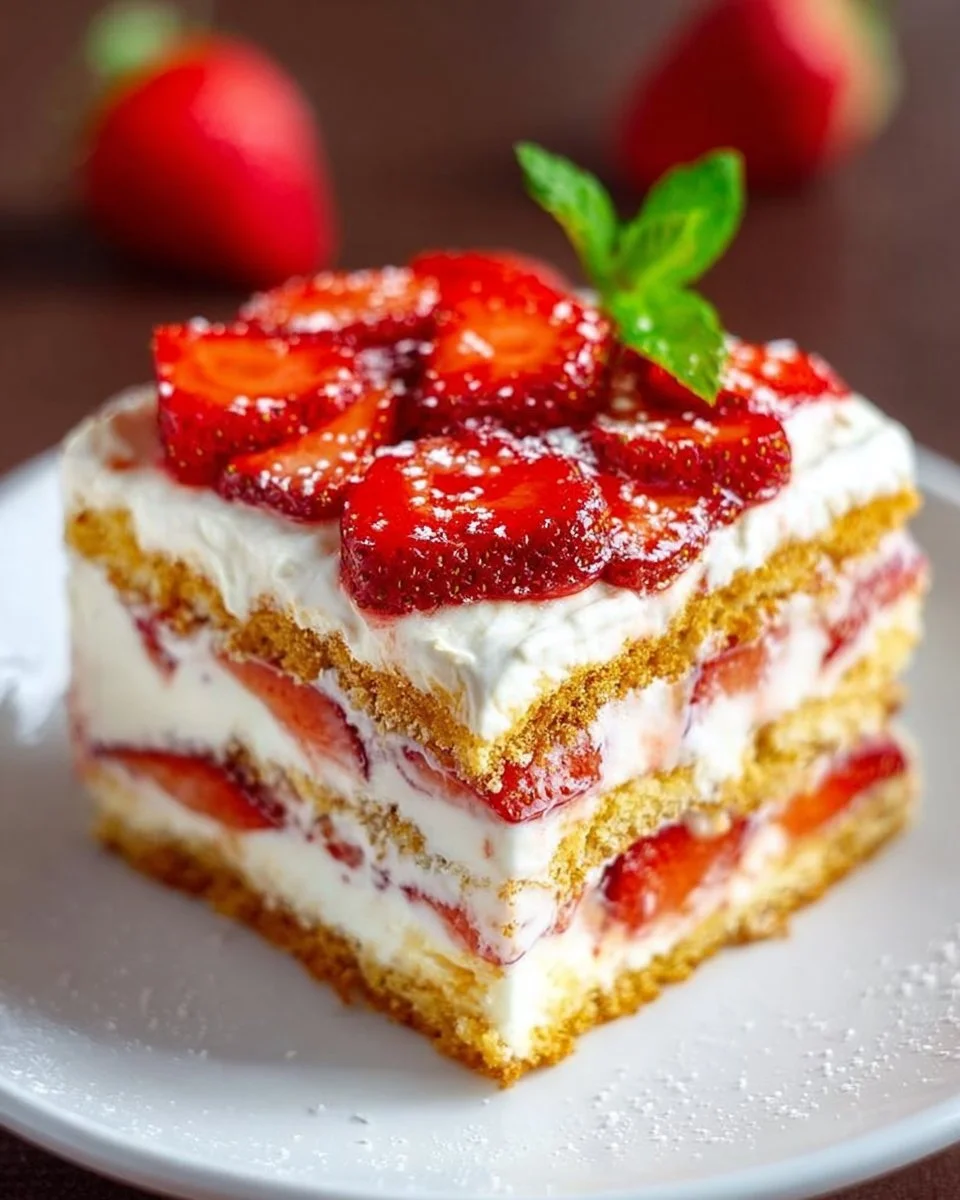 A decadent dessert featuring layers of fresh strawberries, fluffy whipped cream, and sponge cake, chilled to perfection for a refreshing treat.