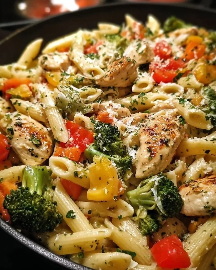 A vibrant and flavorful pasta dish packed with tender chicken and a medley of fresh vegetables, perfect for a family dinner.
